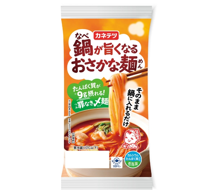 これらの困りごとの解決に向け開発された同品は、同社がこれまでに培ってきた魚の加工技術を活用したカニかまで作られた麺。従来から鍋の〆として食べられている中華麺やうどん、飯などと比較して炭水化物が少なく、併せてタンパク質も摂れて体にやさしい。