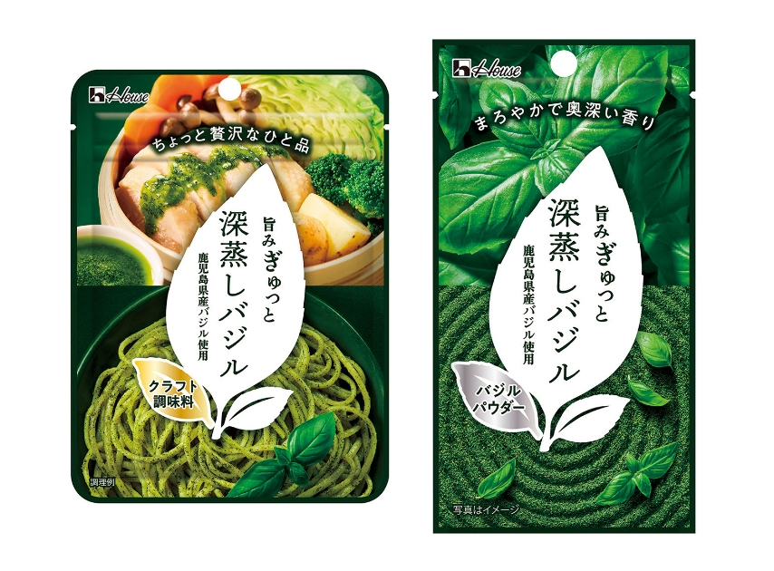 「深蒸しバジル」は、蒸す、揉む、乾燥させるという日本茶の製法をヒントに考案した独自製法“旨みぎゅっと深蒸し製法”で仕上げた。収穫後に手早く葉を蒸し、鮮やかな色味を保持。うまみ成分のグルタミン酸や、グアニル酸などが作られ、料理に深く上品な味わいを与える。