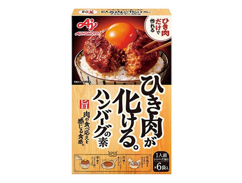 ひき肉に混ぜるだけで、専門店品質の肉の食べ応えを感じるハンバーグが誰でも簡単に作れる。準備する材料は、ひき肉のみ。玉ネギ、パン粉、卵、牛乳も不要。調理時間は約15分で、一般的なハンバーグ※1の約半分に短縮。